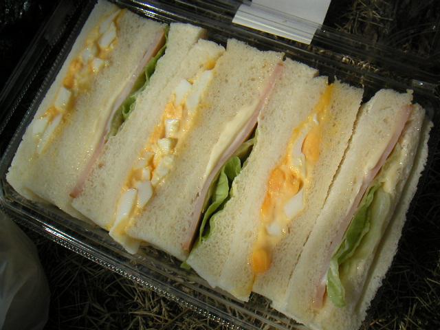 タマゴサンド、ハムチーズレタスサンドが交互に3ヶづつパックされ