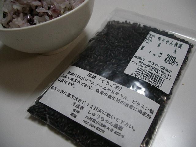 山辺温泉保養センターの中に併設されてるやまのべ温泉市で販売されていた「しゅうちゃん農園の黒米(くろまい)」です。