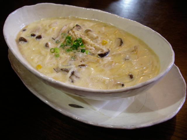 米沢牛のステーキやカレー・焼肉・ハンバーグの盛り合わせ等が好評な童夢さんの「きのこ入りコーンスープスパゲッティ」です。