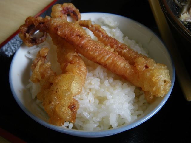 付け合わせも出来る下足天丼(げそ天丼) とり天丼や鳥そぼろ丼も選べます・・・