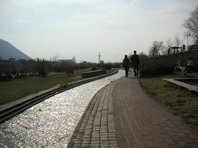 せせらぎ水路を西(夕暮れ)にむかって、、二人のカップルが歩いていきます。。。