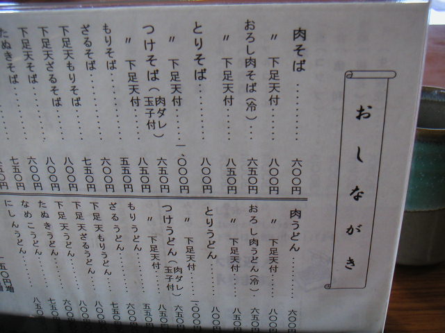そば処 多喜のお品書きです。