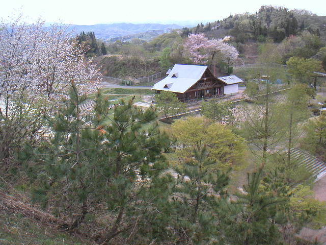 絶景です。いこいの森全景はもちろん、朝日連峰まで望めます。三角の大屋根は、管理棟の森のいえです。