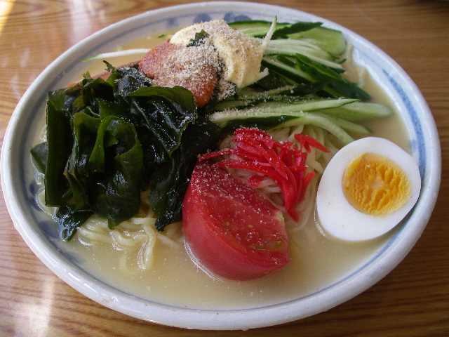 唐辛子やにんにくを調合した「自家製辛みそ」をとかしながらたべる味噌ベースの冷やし中華です。