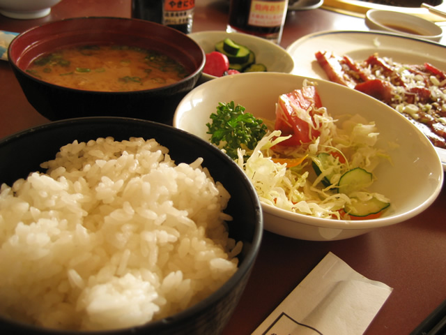 ライス・サラダ・味噌汁・ドリンクもついてきます。