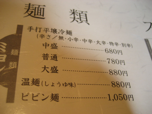 メニューのアップです。ピビン麺が気になります。