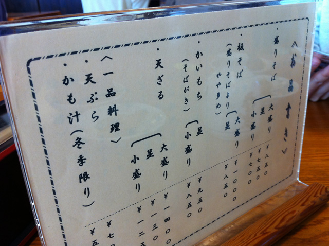 メニューはシンプルに。 ちなみに、大石田の本店では「盛りそば(食べ放題)」のみ。
