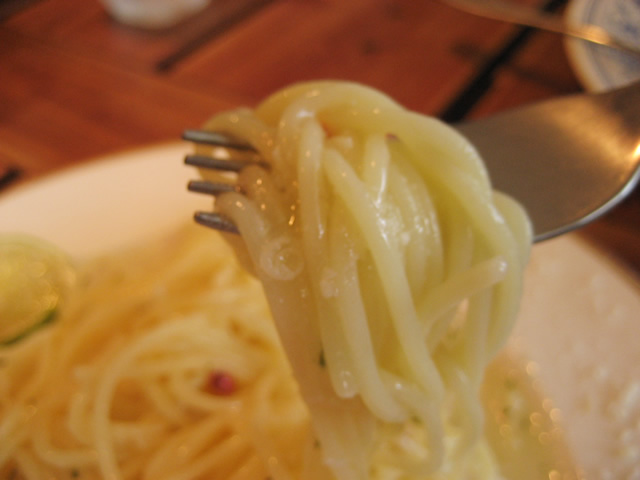 ひんやり冷えてコシのあるスパゲティです。 ドレッシングソースと絡んで絶妙。