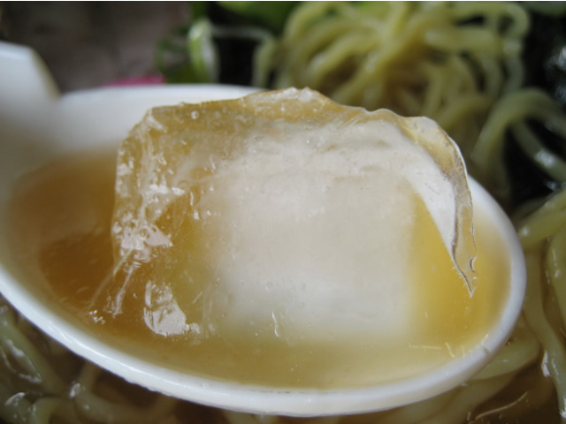 冷やしラーメンではおなじみの氷。スープは透き通ったあっさり系。