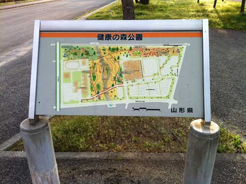 健康の森公園(やまがたけんこうのもりこうえん) 山形県山形市大字青柳 ※JR南出羽駅を降りると直ぐ。 駐車場完備/トイレ/遊具/四阿(あずまや)/芝生広場/築山/池/橋梁