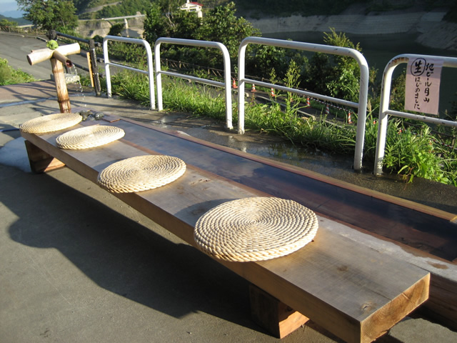 売店の裏には月山湖を一望しながら足湯を愉しむことができます。 現在この足湯の名前を募集しており、店内にてアンケートを実施中。