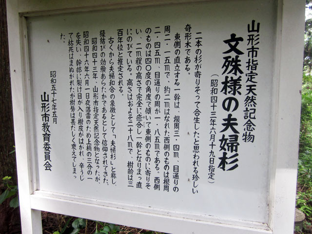 「若木の文殊様」で知られている出塩文殊堂の前、 石階段の参道の右手にあります。 名称/文殊様の夫婦杉(もんじゅさまのめおとすぎ) 場所/山形市大字村木沢6048(良向寺) 指定名/市指定天然記念物 指定年月日/昭和43年6月19日 所有者/良向寺 見学/随時可能