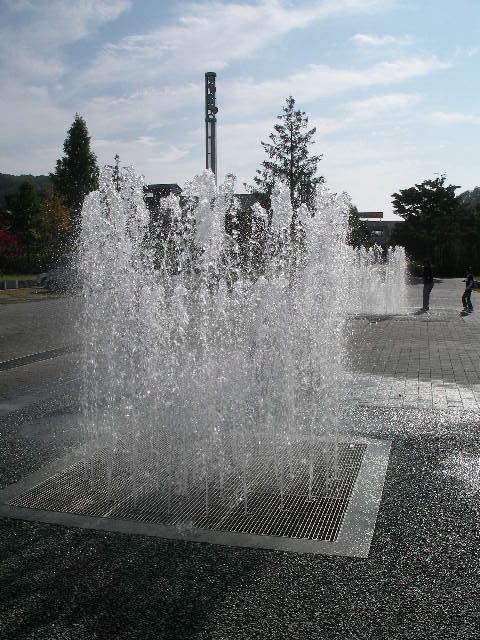 日中は15分ごとに噴水とミストシャワーが出てきます。 子どもたちに大受けの広々とした公園です。
