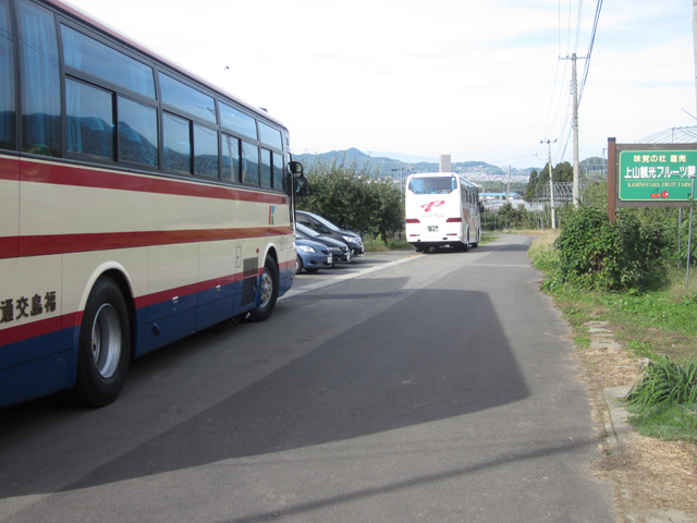 観光バスが2台きており、 賑わっております。 遠くには上山市街が見えます。