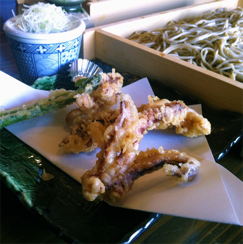 揚げたてのげそ天と季節の野菜天に 抹茶塩がそえてあります。