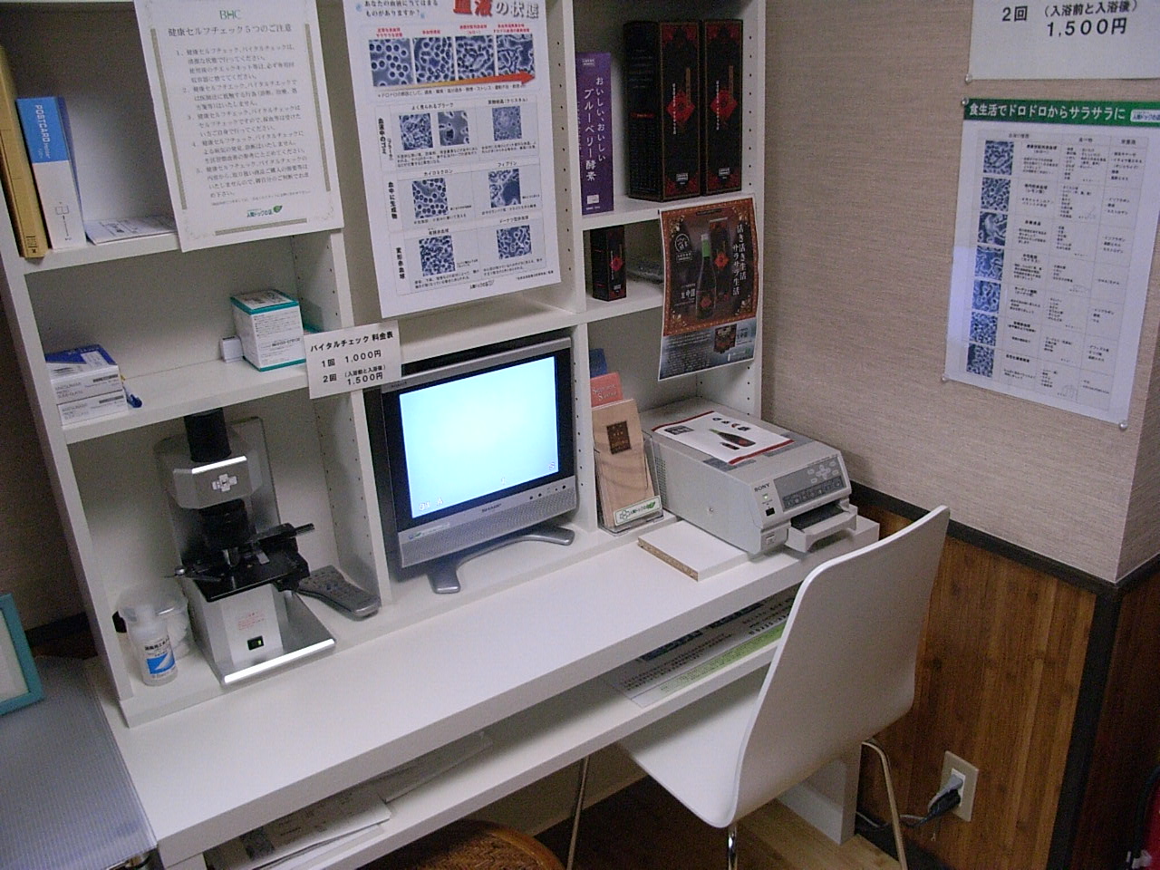 こちらは自分の血液を顕微鏡で調べる機械。 ドロドロ血の心配のある方にはぜひオススメします。 1回1,000円です。