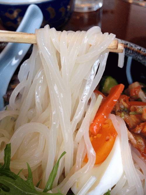 もっちりつるつるしこしこ・・・白く半透明の盛岡冷麺。