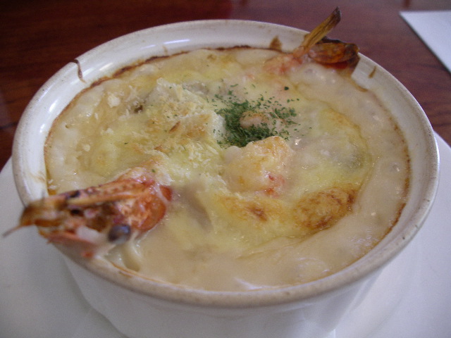 こちらはあつあつの「エビとホタテのドリア」です。 珍しいローストタイプのタバスコを好みでかけることが出来ます。