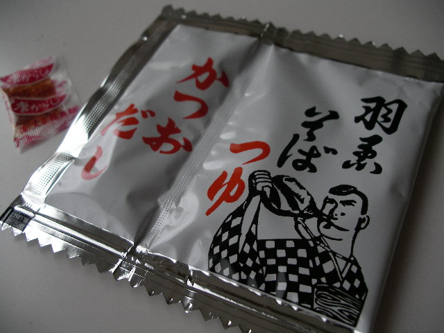 羽黒そばには、蕎麦つゆと粉末のかつおだしが付いています。