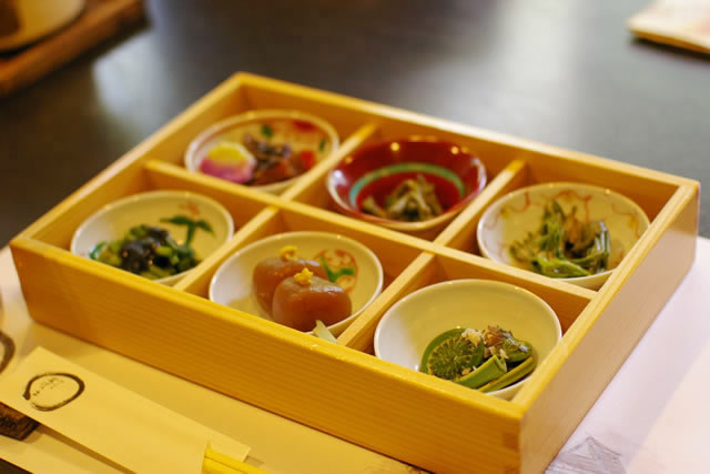 ●たらの芽 胡麻味噌和え ●こごみ 胡桃 ●祝肴 カラカイの煮物 ●こしあぶら 胡麻醤油 ●くわだい 黒胡麻がけ ●山形名産 玉こんにゃく