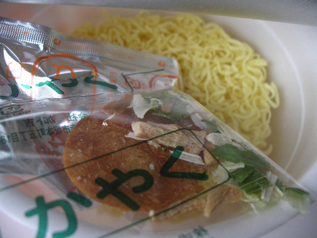 ノンフライ麺とかやくと醤油スープです。