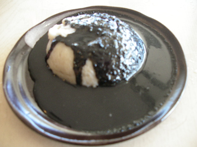 甘めのごまだれとあつあつふわふわのそばがきが良くあいます。