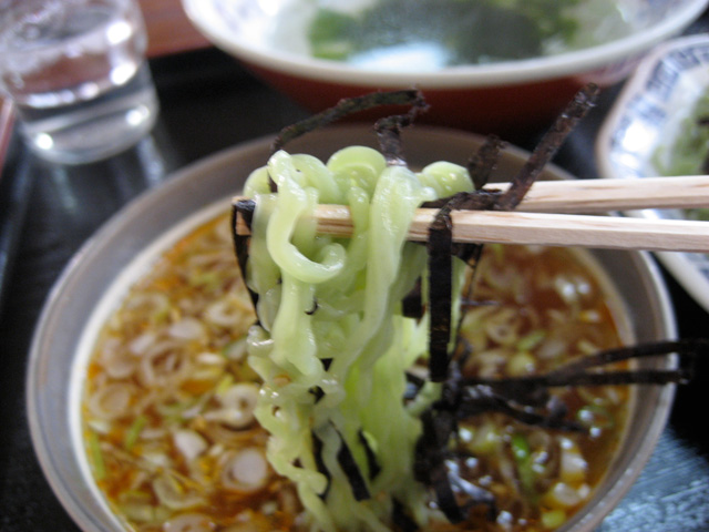 緑黄色野菜を練り込んだ、緑色の手打ち麺。