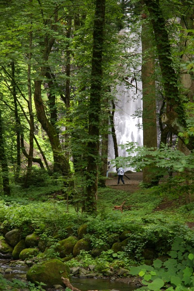 玉簾の滝は、弘法大師開基の御嶽神社(みたけじんじゃ)すぐ裏手にあり、 苔が生す大木そびえる杉林に囲まれ、幻想的な雰囲気を漂わせています。