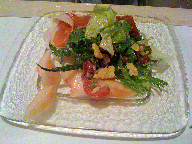高畠町でとれたオーガニック春菊のサラダ 春菊の香りが強くとてもみずみずしいサラダです。 また、フルーツもお皿にはトッピングされていました。こちらは600円くらいです。