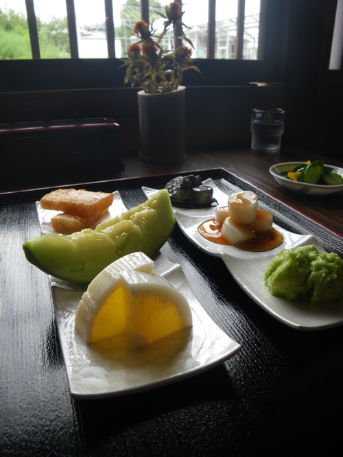 胡麻団子、醤油団子、じんだん団子・・ しみ餅、メロン、寒天、お茶、漬物・・・