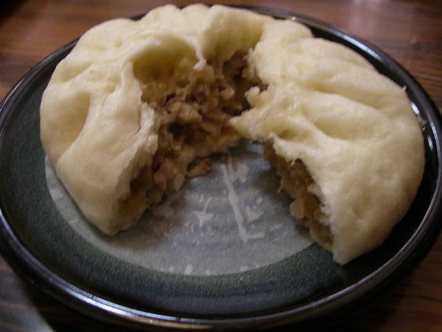 あつあつの豚まんをおもむろに割ってみると、肉汁じゅわー。