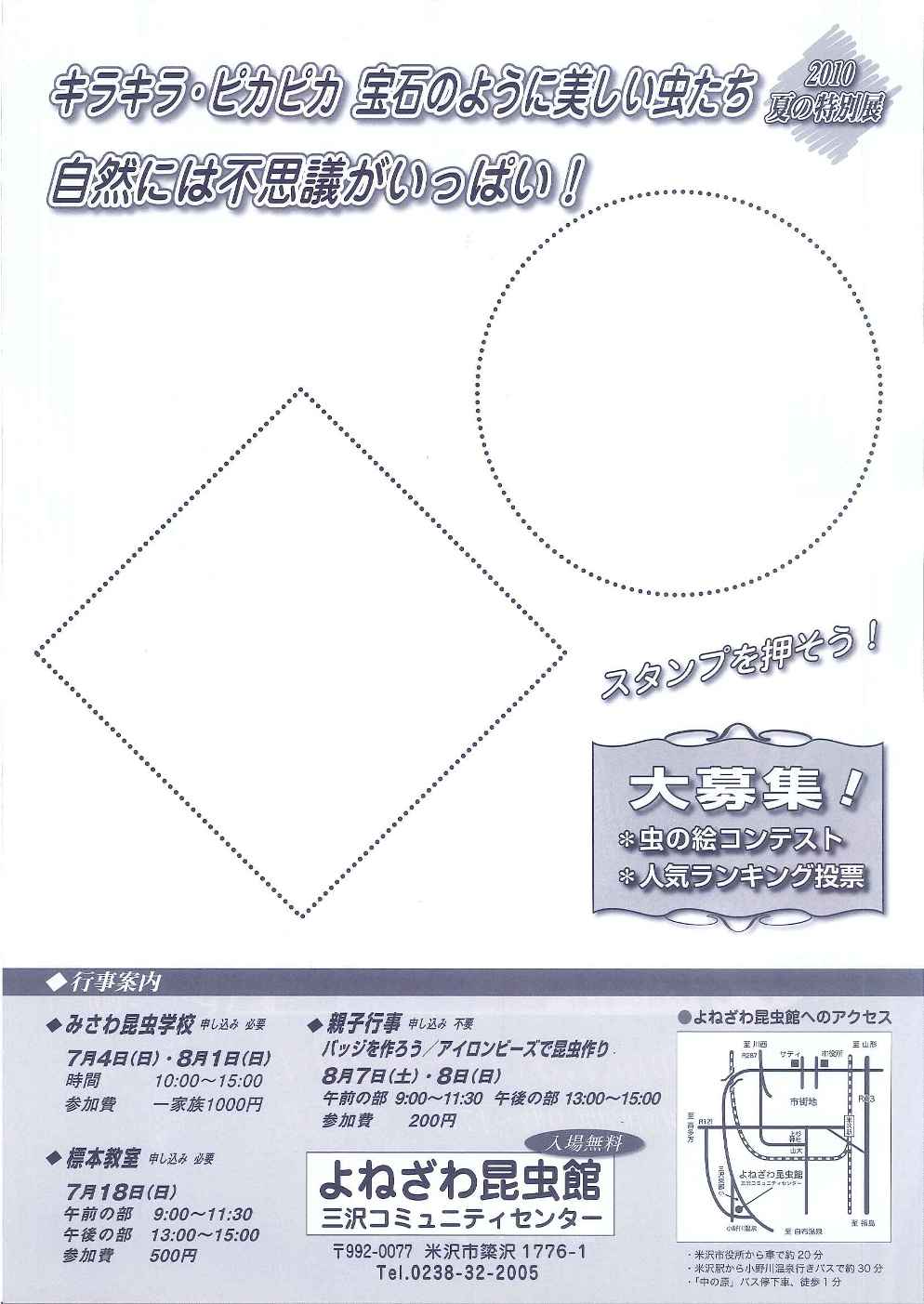 行事案内 ◇みさわ昆虫学校 申込必要 7月4日(日)9月1日(日) 時間 10:00〜15:00 参加費 一家族1,000円 ◇標本教室 申込必要 7月18日(日) 午前の部 9:00〜11:30 午後の部 13:00〜15:00 参加費500円 ◇親子行事 申込不要 バッジを作ろう・アイロンビーズで昆虫作り 8月7日(土)・8日(日) 午前の部 9:00〜11:30 午後の部 13:00〜15:00 参加費200円