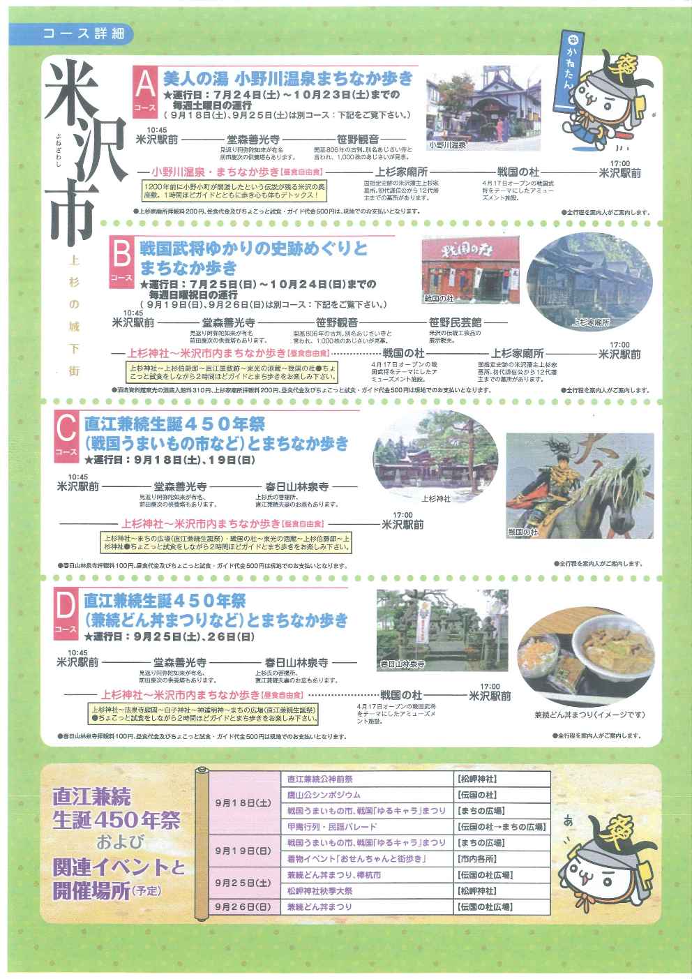 Aコース 7月24日(土)〜10月23日(土)までの 毎週土曜日の運行 ※9月18,25日は別コース 「美人の湯 小野川温泉まちなか歩き」 Bコース 7月25日(日)〜10月24日(日)までの 毎週日曜祝日の運行 ※9月19、26日は別コース 「戦国武将ゆかりの史跡めぐりとまちなか歩き」 Cコース 9月18日(土)、19日(日) 「直江兼続生誕450年祭」(戦国うまいもの市) とまち歩き Dコース 9月25日(土)、26日(日) 「直江兼続生誕450年祭」(兼続どん丼まつり) とまち歩き