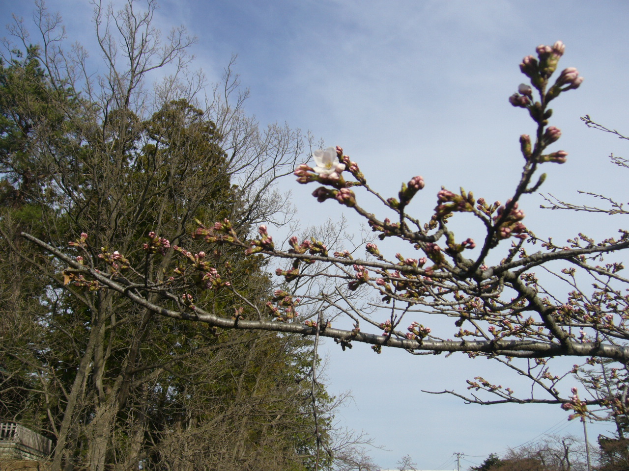 ようやく1,2輪ほど咲いているのを発見。 お堀沿いをぐるっと見たところ、咲いているのはお堀西南角のこの2本の木くらいでした。 神社内にはお花見で宴会をしているグループが昨日あたりからちらほら。 露店もようやくオープンしてました。