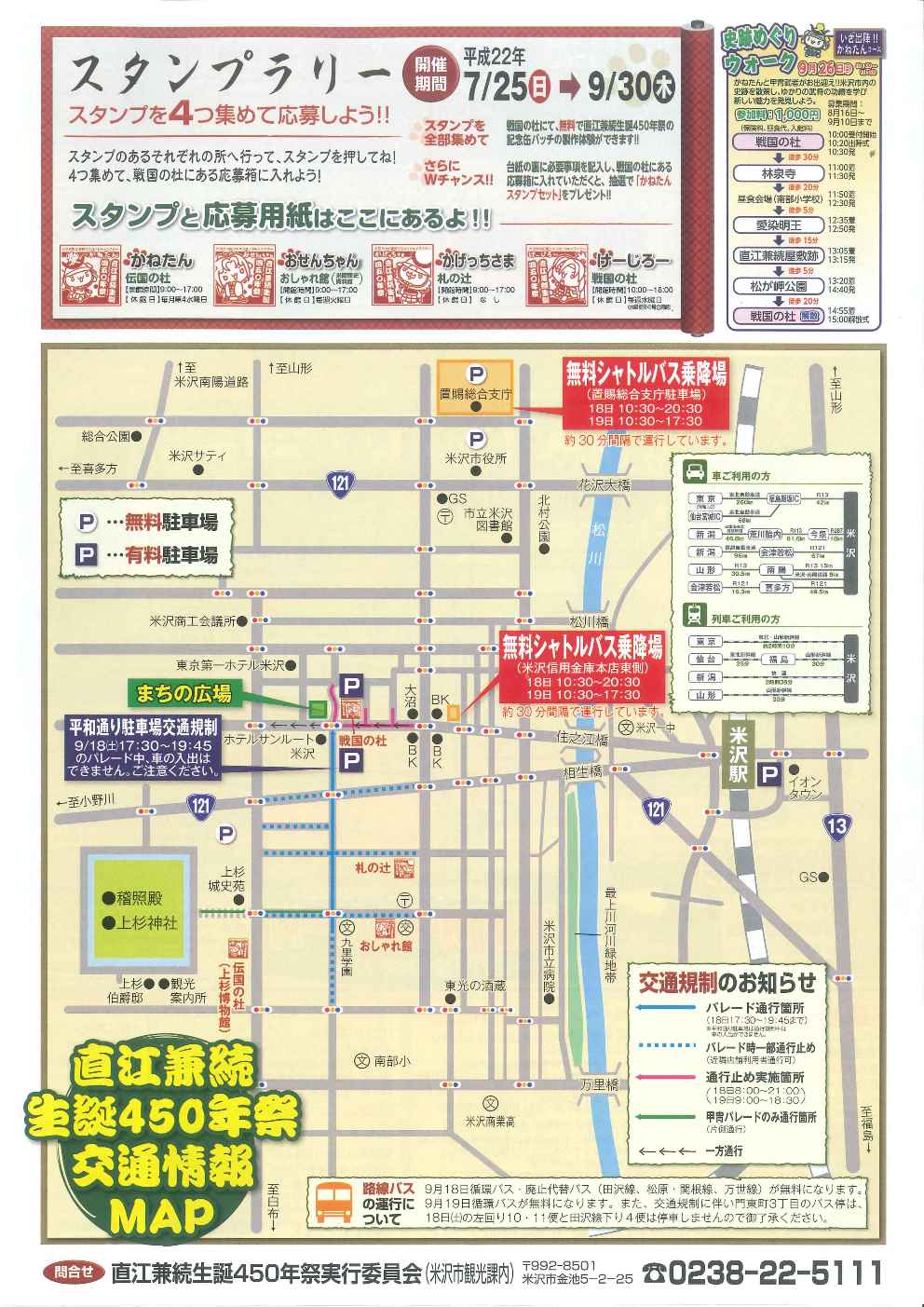 無料シャトルバスのご案内 近隣駐車場のご案内 交通規制のお知らせ 路線バスの無料化のお知らせ お問合せ 直江兼続生誕450年祭実行委員会 米沢市観光課内 0238−22−5111 〒992−8501 米沢市金池5−2−25