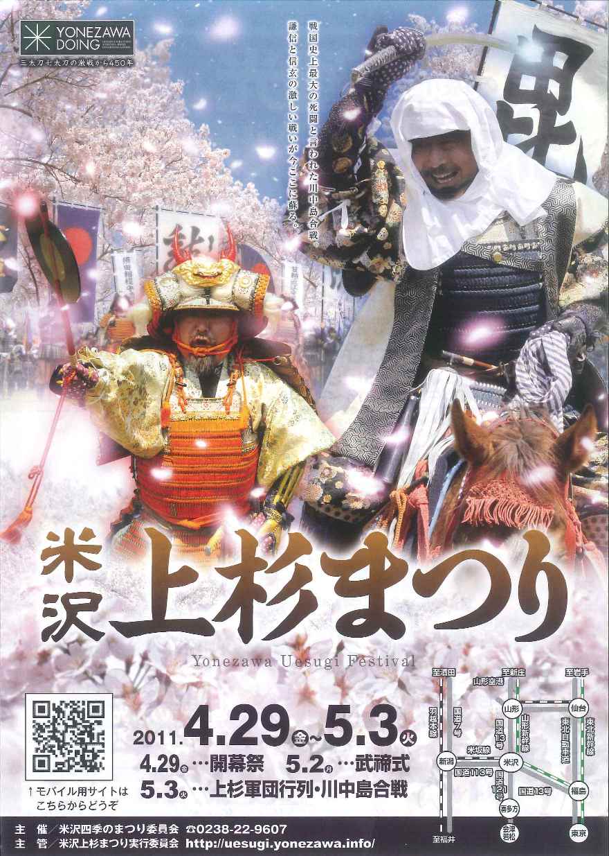 今年の上杉まつりの予告チラシです! 桜花爛漫 豪華絢爛 春の一大イベント 米沢上杉まつり! ぜひお越しください!