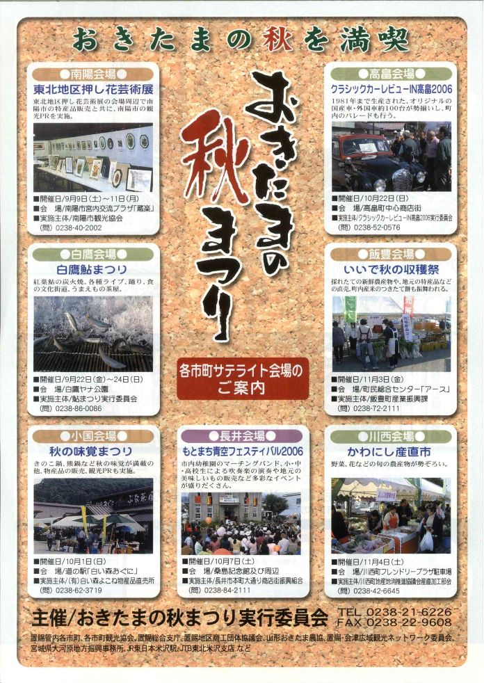 ◎南陽会場 「東北地区押し花芸術展」 開催日 9月9日(土)〜11日(月) 会 場 南陽市宮内交流プラザ「蔵楽」 問合せ:南陽市観光協会 0238-40-2002 ◎白鷹会場 「白鷹鮎まつり」 開催日 9月22日(金)〜24日(日) 会 場 白鷹ヤナ公園 問合せ:鮎まつり実行委員会 0238-86-0086 ◎小国会場 「秋の味覚まつり」 開催日 10月1日(日) 会 場 道の駅「白い森おぐに」 問合せ:白い森よこね物産品直売所 0238-62-3719 ◎長井会場 「もとまち青空フェスティバル2006」 開催日 10月7日(土) 会 場 桑島記念館及び周辺 問合せ:長井市本町大通商店街振興組合 0238-84-2111 ◎高畠会場 「クラシックカーレビューin高畠2006」 開催日 10月22日(日) 会 場 高畠町中心商店街 問合せ:クラシックカーレビュー実行委員会 0238-52-0576 ◎飯豊会場 「いいで秋の収穫祭」 開催日 11月3日(金) 会 場 町民総合センター「アース」 問合せ:飯豊町産業振興課 0238-72-2111 ◎川西会場 「かわにし産直市」 開催日 11月4日(土) 会 場 川西町フレンドリープラザ駐車場 問合せ:川西町地産地消推進協議会産直加工部会 0238-42-6645