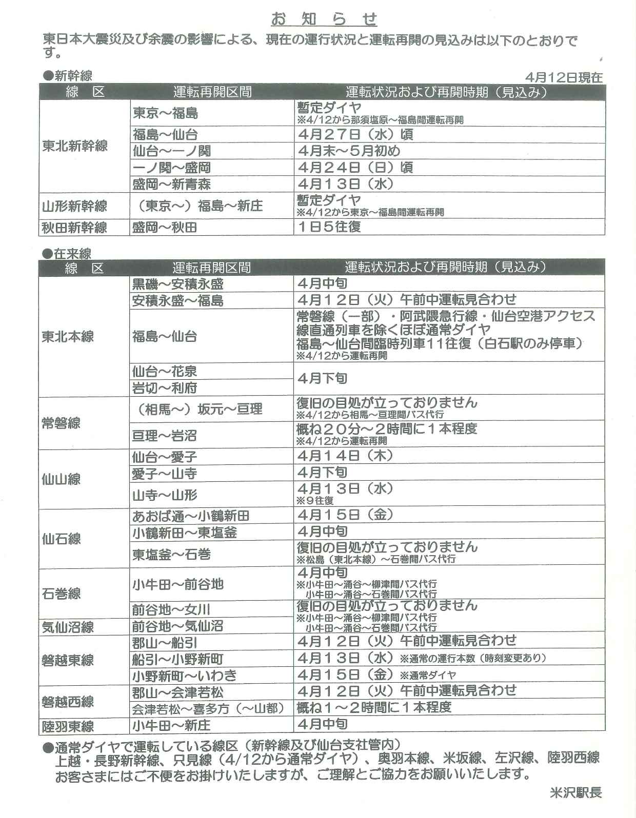 東北新幹線、山形新幹線、秋田新幹線 在来線の運行状況及び再開時期