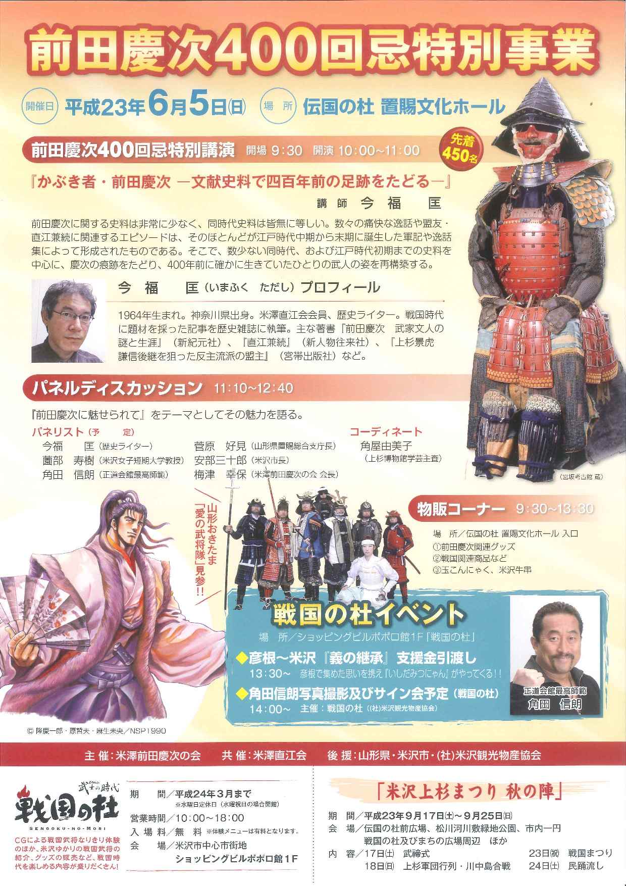 前田慶次400回忌特別事業 日時 平成23年6月5日(日) 場所 伝国の杜 置賜文化ホール 内容 前田慶次400回忌特別講演 開場9:30 開演 10:00〜11:00 「かぶき者 前田慶次 文献資料で四百年前の足跡をたどる」 講 師 今福匡氏 パネルディスカッション 11時10分〜12時40分 前田慶次に魅せられてをテーマとして その魅力を語る。 戦国の杜イベント 物販コーナー 愛の武将隊も出演!