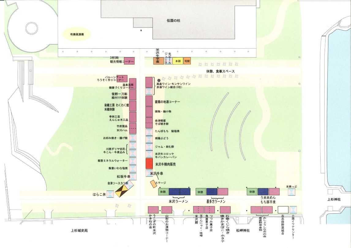 おきたまの秋まつり 伝国の杜前広場 会場図 上部が伝国の杜(上杉博物館) 右側が上杉神社 下部が上杉城史苑 左側が県道 白布街道 方角は上が南で表しております。