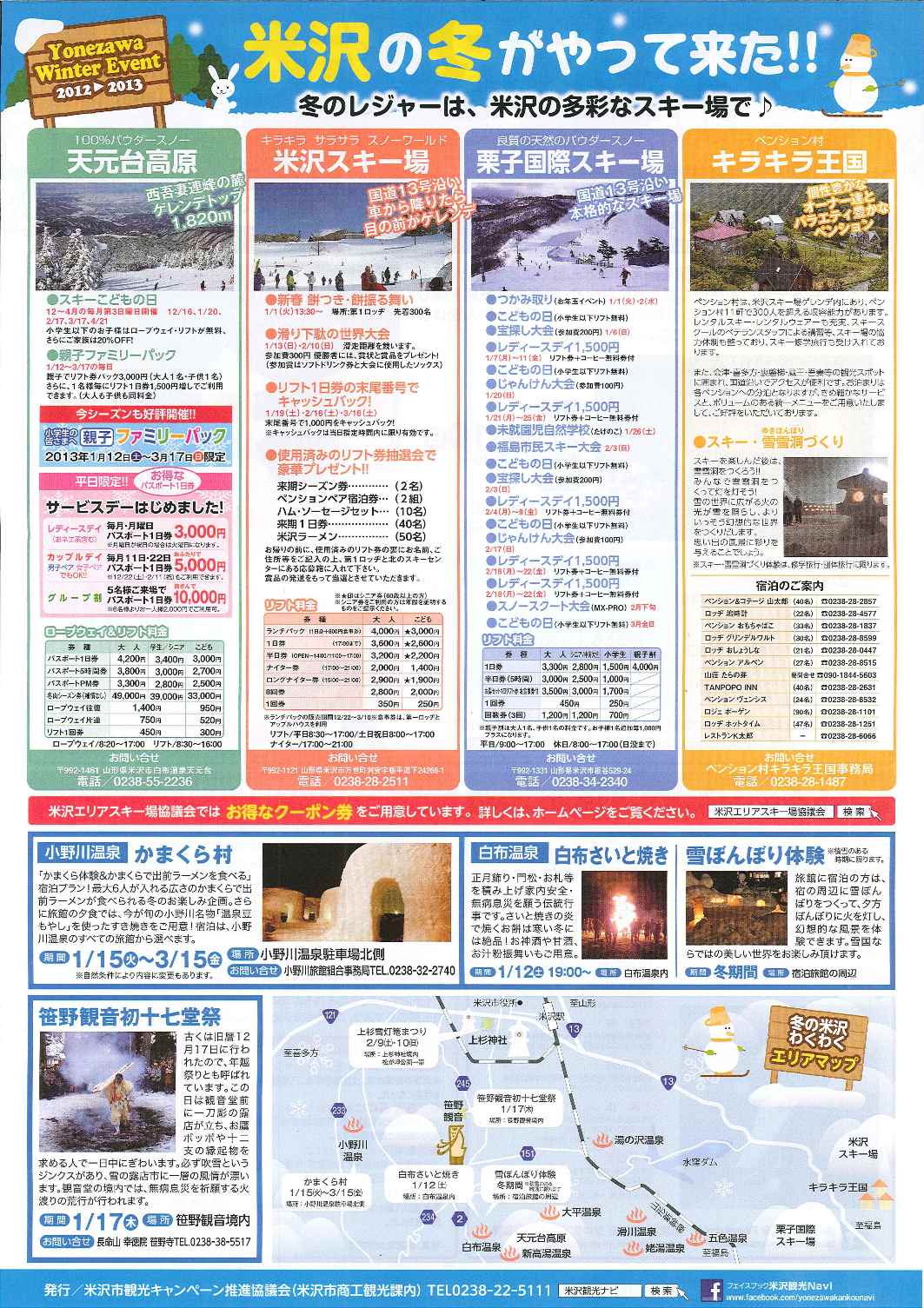 小野川温泉 かまくら村 期間 平成25年1月15日(火)〜3月15日(金) ※自然条件により内容に変更もあります。 場所 小野川温泉駐車場北側 お問合せ 小野川旅館組合事務局 TEL0238−32−2740 「かまくら体験&かまくらで出前ラーメン を食べる」宿泊プラン! 最大6人が入られる広さのかまくらで出前ラーメンが 食べられる冬のお楽しみ企画。 さらに旅館の夕食では、今が旬の小野川名物 「温泉豆もやし」を使ったすき焼きをご用意! 宿泊は、小野川温泉のすべての旅館から選べます。 白布温泉 白布温泉開湯700年の歴史ある温泉です。 白布さいと焼き 期間 1月12日(土)19:00〜 場所 白布温泉内 正月飾り・門松・お札等を積み上げ 家内安全・無病息災を願う伝統行事です。 さいと焼きの炎で焼くお餅は寒い冬には絶品! お神酒や甘酒、お汁粉振舞いもご用意。 ※白布温泉に宿泊の方はお祭りに参加できます。 雪ぼんぼり体験 期間 冬期間 ※積雪のある時期に限ります。 場所 宿泊旅館の周辺 旅館に宿泊の方は、宿の周辺に雪ぼんぼりをつくって、 夕方ぼんぼりに火を灯し幻想的な風景を体験できます。 雪国ならではの美しい世界をお楽しみいただけます。 ※ローソクは無料です。 お問い合せ 白布温泉観光協会 TEL0238−55−2205 笹野観音初十七堂祭 期間 1月17日(木) 場所 笹野観音境内 お問合せ 長命山 幸徳院 笹野寺 TEL0238−38−5517 古くは旧暦12月17日に行われたので、年越祭りとも 呼ばれています。この日は観音堂前に一刀彫の露店 が立ち、お鷹ポッポや十二支の縁起物を求める人で 一日中にぎわいます。必ず吹雪というジンクスがあり、 雪の露店市に一層の風情が漂います。観音堂の境内で は、無病息災を祈願する火渡りの荒行が行われます。 発行/米沢市観光キャンペーン推進協議会(米沢市商工観光課内) TEL0238ー22ー5111
