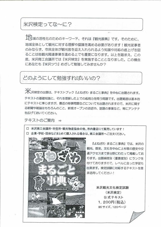 ※画像をクリックしてください。 テキストのご案内 米沢商工会議所・米沢市役所・米沢観光物産協会のほか、市内書店にて販売しております。 企業、学校、団体などまとめて購入される場合は、米沢商工会議所 電話0238−21−5111へご注文ください。 米沢観光文化検定 公式テキスト 1,200円税込み