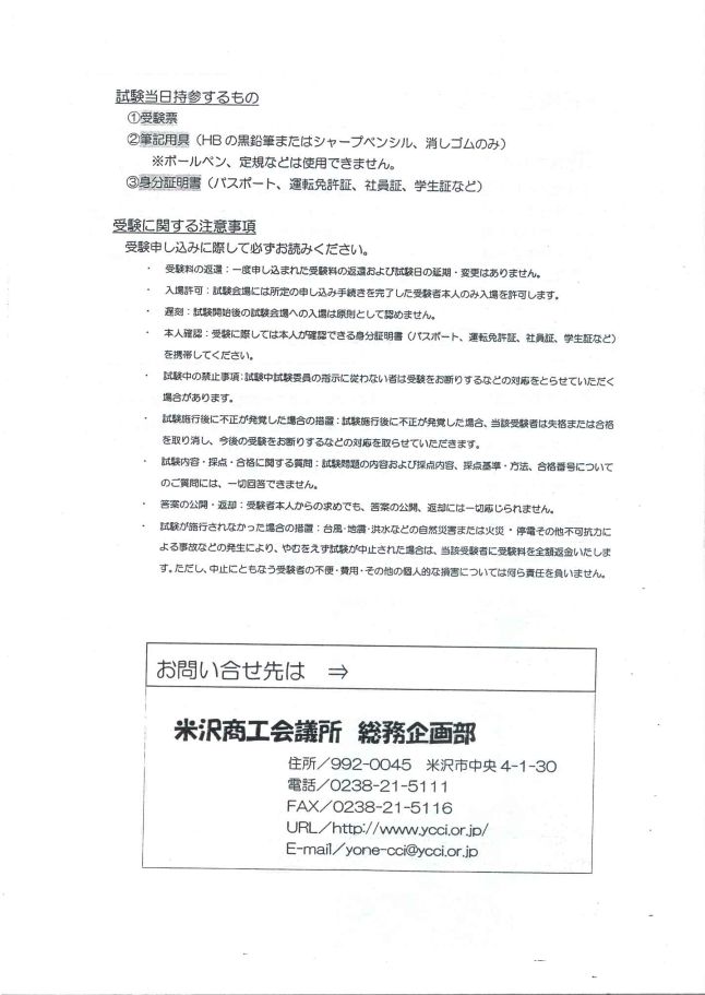 »î¸³ÅöÆü»ý»²¤¹¤ë¤â¤Î ¡¼õ¸³É¼ ¢É®µÍѶñ¡ÊHB¤Î¹õ±ôÉ®¤Þ¤¿¤Ï¥·¥ã¡¼¥×¥Ú¥ó¥·¥ë¡¢¾Ã¤·¥´¥à¤Î¤ß¡Ë ¢¨¥Ü¡¼¥ë¥Ú¥ó¡¢Ä구¤Ê¤É¤Ï»ÈÍѤǤ¤Þ¤»¤ó¡£ £¿Èʬ¾ÚÌÀ½ñ¡Ê¥Ñ¥¹¥Ý¡¼¥È¡¢±¿Å¾Ìȵö¾Ú¡¢¼Ò°÷¾Ú¡¢³ØÀ¸¾Ú¤Ê¤É¡Ë ¼õ¸³¤Ë´Ø¤¹¤ëÃí°Õ»ö¹à ¼õ¸³¿½¤·¹þ¤ß¤ËºÝ¤·¤ÆÉ¬¤º¤ªÆÉ¤ß¤¯¤À¤µ¤¤¡£ ¡¦¼õ¸³ÎÁ¤ÎÊÖ´Ô¡§°ìÅÙ¿½¤·¹þ¤Þ¤ì¤¿¼õ¸³ÎÁ¤ÎÊÖ´Ô¤ª¤è¤Ó»î¸³Æü¤Î±ä´ü¡¦Êѹ¹¤Ï¤¢¤ê¤Þ¤»¤ó¡£ ¡¦Æþ¾ìµö²Ä¡§»î¸³²ñ¾ì¤Ë¤Ï½êÄê¤Î¿½¤·¹þ¤ß¼ê³¤¤ò´°Î»¤·¤¿¼õ¸³¼ÔËÜ¿Í¤Î¤ßÆþ¾ì¤òµö²Ä¤·¤Þ¤¹¡£ ¡¦Ãٹ»î¸³³«»Ï¸å¤Î»î¸³²ñ¾ì¤Ø¤ÎÆþ¾ì¤Ï¸¶Â§¤È¤·¤ÆÇ§¤á¤Þ¤»¤ó¡£ ¡¦ËܿͳÎǧ¡§¼õ¸³¤ËºÝ¤·¤Æ¤ÏËܿͤ¬³Îǧ¤Ç¤¤ë¿Èʬ¾ÚÌÀ½ñ¡Ê¥Ñ¥¹¥Ý¡¼¥È¡¢±¿Å¾Ìȵö¾Ú¡¢¼Ò°÷¾Ú¡¢³ØÀ¸¾Ú¤Ê¤É¡Ë¤ò·ÈÂÓ¤·¤Æ¤¯¤À¤µ¤¤¡£ ¡¦»î¸³Ãæ¤Î¶Ø»ß»ö¹à¡§»î¸³Ãæ»î¸³°Ñ°÷¤Î»Ø¼¨¤Ë½¾¤ï¤Ê¤¤¼Ô¤Ï¼õ¸³¤ò¤ªÃǤꤹ¤ë¤Ê¤É¤ÎÂбþ¤ò¤È¤é¤»¤Æ¤¤¤¿¤À¤¯¾ì¹ç¤¬¤¢¤ê¤Þ¤¹¡£ ¡¦»î¸³»Ü¹Ô¸å¤ËÉÔÀµ¤¬È¯³Ð¤·¤¿¾ì¹ç¤ÎÁ¼ÃÖ¡§»î¸³»Ü¹Ô¸å¤ËÉÔÀµ¤¬È¯³Ð¤·¤¿¾ì¹ç¡¢Åö³º¼õ¸³¼Ô¤Ï¼º³Ê¤Þ¤¿¤Ï¹ç³Ê¤ò¼è¤ê¾Ã¤·¡¢º£¸å¤Î¼õ¸³¤ò¤ª ÃǤꤹ¤ë¤Ê¤É¤ÎÂбþ¤ò¼è¤é¤»¤Æ¤¤¤¿¤À¤¤Þ¤¹¡£ ¡¦»î¸³ÆâÍÆ¡¦ºÎÅÀ¡¦¹ç³Ê¤Ë´Ø¤¹¤ë¼ÁÌä¡§»î¸³ÌäÂê¤ÎÆâÍÆ¤ª¤è¤ÓºÎÅÀÆâÍÆ¡¢ºÎÅÀ´ð½à¡¦ÊýË¡¡¢¹ç³ÊÈÖ¹æ¤Ë¤Ä¤¤¤Æ¤Î¤´¼ÁÌä¤Ë¤Ï¡¢°ìÀÚ²óÅú¤Ç¤ ¤Þ¤»¤ó¡£ ¡¦Åú°Æ¤Î¸ø³«¡¦Êֵѡ§¼õ¸³¼ÔËܿͤ«¤é¤Îµá¤á¤Ç¤â¡¢Åú°Æ¤Î¸ø³«¡¢ÊֵѤˤϰìÀÚ±þ¤¸¤é¤ì¤Þ¤»¤ó¡£ ¡¦»î¸³¤¬»Ü¹Ô¤µ¤ì¤Ê¤«¤Ã¤¿¾ì¹ç¤ÎÁ¼ÃÖ¡§ÂæÉ÷¡¦ÃϿ̡¦¹¿¿å¤Ê¤É¤Î¼«Á³ºÒ³²¤Þ¤¿¤Ï²ÐºÒ¡¦ÄäÅŤ½¤Î¾ÉԲĹ³ÎϤˤè¤ë»ö¸Î¤Ê¤É¤ÎȯÀ¸¤Ë¤è¤ê¡¢¤ä ¤à¤ò¤¨¤º»î¸³¤¬Ãæ»ß¤µ¤ì¤¿¾ì¹ç¤Ï¡¢Åö³º¼õ¸³¼Ô¤Ë¼õ¸³ÎÁ¤òÁ´³ÛÊֶ⤤¤¿¤·¤Þ¤¹¡£¤¿¤À¤·¡¢Ãæ»ß¤Ë¤È¤â¤Ê¤¦¼õ¸³¼Ô¤ÎÉÔÊØ¡¦ÈñÍÑ¡¦¤½¤Î¾¤Î¸Ä¿ÍŪ¤Ê» ³²¤Ë¤Ä¤¤¤Æ¤Ï²¿¤éÀÕǤ¤òÉ餤¤Þ¤»¤ó¡£ ¤ªÌ䤤¹ç¤ï¤»Àè¤Ï ÊÆÂô¾¦¹©²ñµÄ½ê¡¡Áí̳´ë²èÉô ½»½ê¡¿992-0045¡¡ÊÆÂô»ÔÃæ±û4-1-30 ÅÅÏá¿0238¡Ý21¡Ý5111 FAX¡¿0238¡Ý21¡Ý5116 e-mail¡¿yone-cci@ycci.or.jp URL¡¿http://www.ycci.or.jp/¡¡