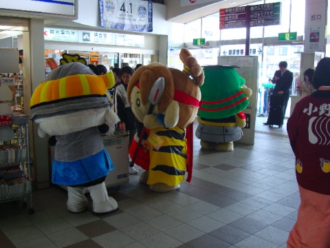 (2012.4.1) 米沢駅改札横のキオスクのアイス販売ケースの前で「かねたん」と「けーじろー」が打ち合わせ? ひとり、時刻表で次のつばさの到着確認する「かげっちさま」 「おせんちゃん」はビュー、みどりの窓口前で静かに待機。 ・直江兼続マスコットキャラクター「けーじろー」へ