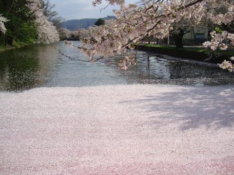 桜吹雪で、お堀に桜の花びらが...