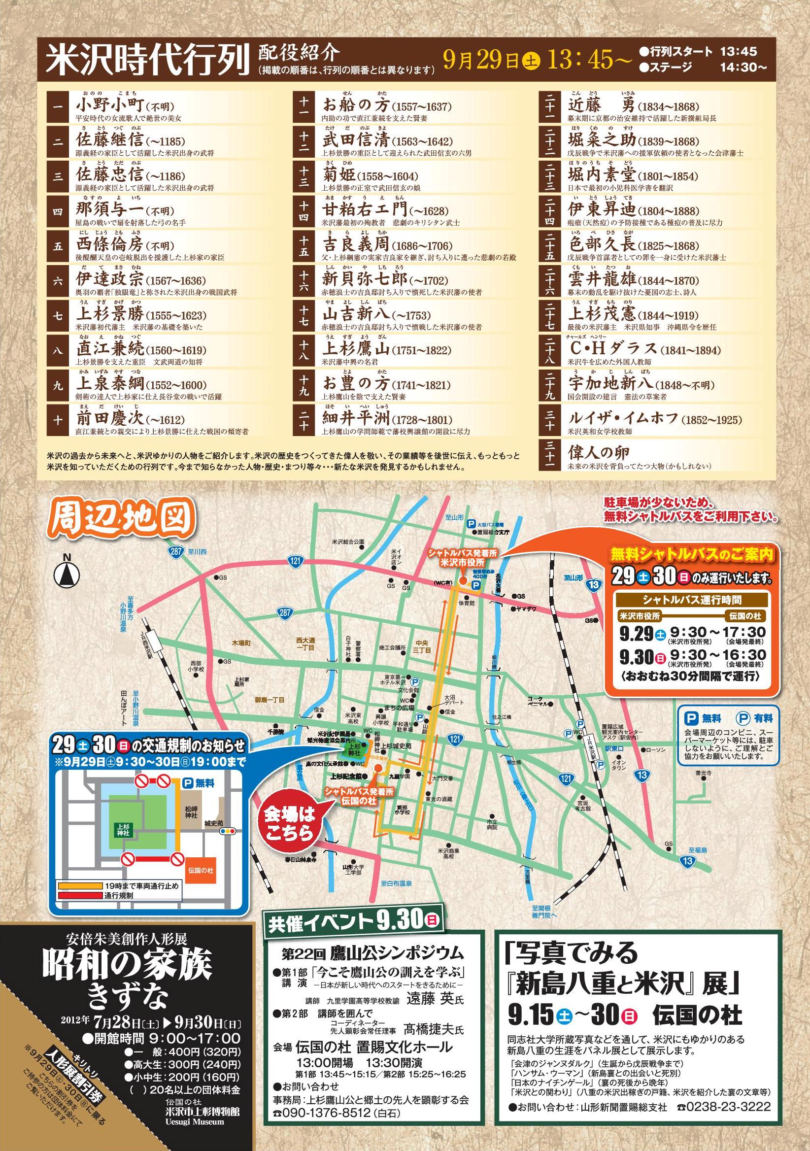 ○米沢時代行列の配役 ○周辺地図 交通規制のお知らせ、駐車場情報 ○無料シャトルバスのご案内 ○共催イベント ・上杉博物館 昭和の家族きずな ・第22回鷹山公シンポジウム ・写真で見る新島八重と米沢展