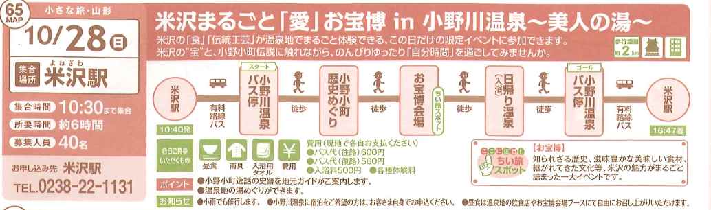 今回のお宝博にあわせて 駅長おすすめの小さな旅を企画いたしました! 10月28日(日) 米沢まるごと「愛」お宝博in小野川温泉〜美人の湯〜 集合時間 10:30 集合場所 米沢駅 募集人員 40名 内容 米沢の食、伝統工芸が温泉地でまるごと体験できる この日だけの限定イベントに参加できます。 米沢の宝と小野小町伝説に触れながら のんびりゆったり自分時間を過ごしてみませんか 行程 10:40発 米沢駅→有料路線バス→小野川温泉→ →小野小町歴史めぐり→お宝博会場→ →日帰り入浴→有料路線バス→米沢駅 16:47着 費用 現地で各自お支払いください バス代 往復 1,160円 入浴料 500円 各種体験料 ポイント 小野小町逸話の史跡を地元ガイドがご案内 温泉地の湯めぐり お宝博の楽しいイベントにぜひ参加してみませんか! お申し込み先 米沢駅 電話0238−22−1131