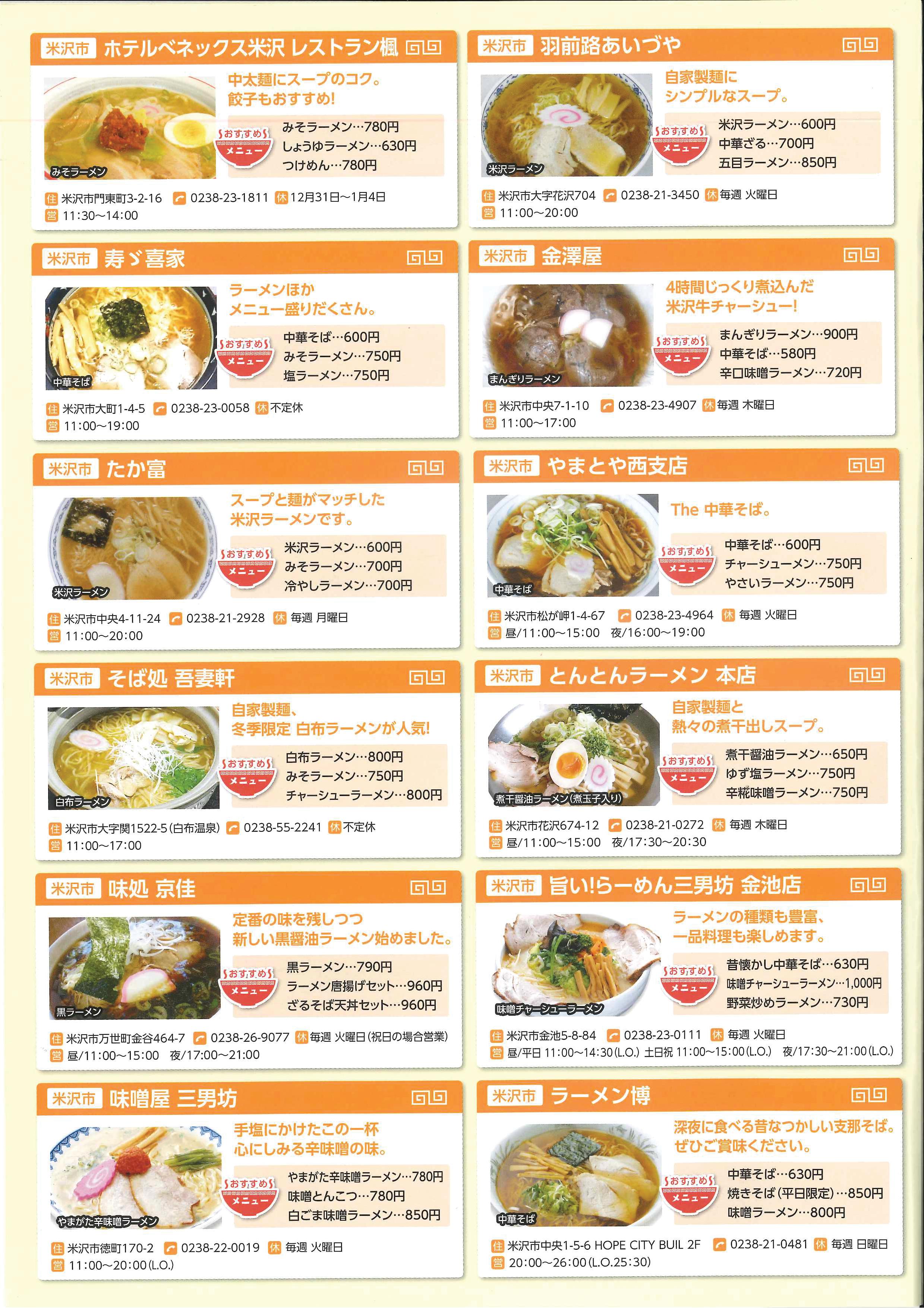 ・ホテルベネックス米沢レストラン楓 ・羽前路あいづや ・寿ゞ喜家 ・金澤屋 ・たか富 ・やまとや西支店 ・そば処吾妻軒 ・とんとんラーメン本店 ・味処京佳 ・旨い!ラーメン三男坊 金池店 ・味噌屋三男坊 ・らーめん博 ・中華麺ごとう ・あたご食堂 ・小牧千食堂 ・りんご苑 米沢店