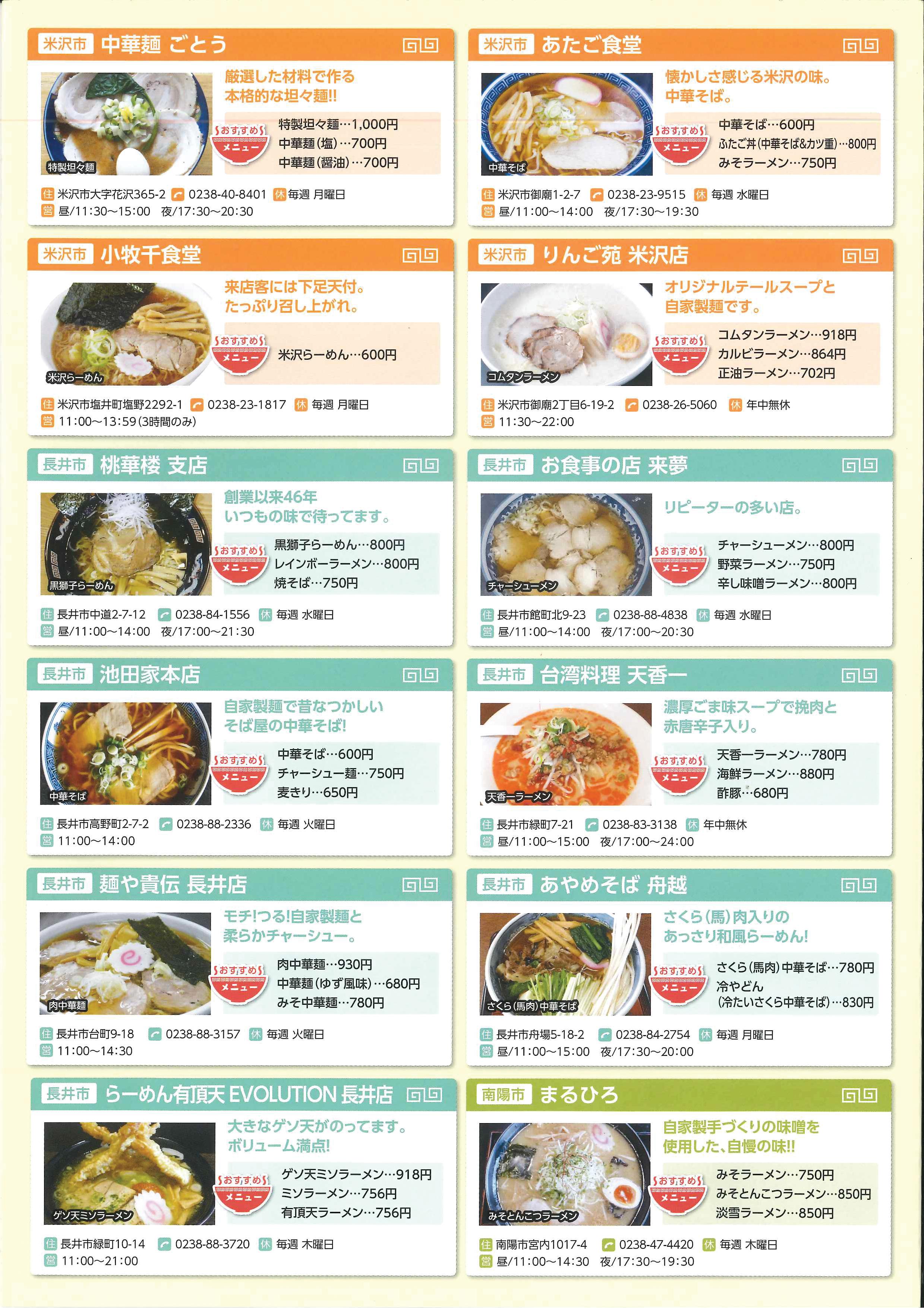 米沢市 ・中華麺ごとう ・あたご食堂 ・小牧千食堂 ・りんご苑米沢店 長井市 ・桃華楼本店 ・池田屋本店 ・台湾料理天香一 ・あやめそば舟越 ・有頂天長井店 ・お食事の店 来夢 ・麺や貴伝 長井店 南陽市 ・まるひろ 次ページへ続きます