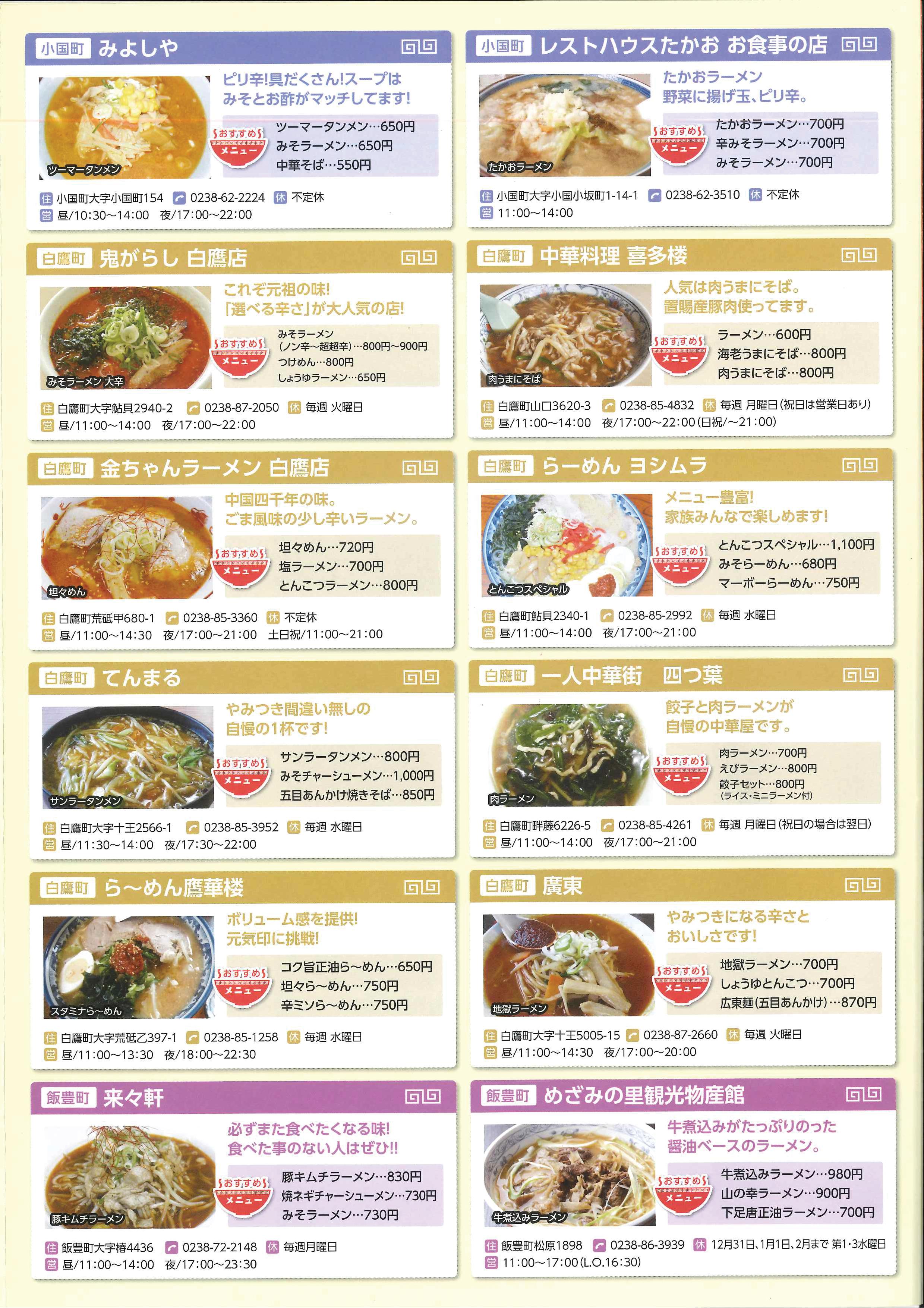小国町 ・みよしや ・レストハウスたかお 白鷹町 ・鬼がらし白鷹店 ・中華料理 喜多楼 ・金ちゃんラーメン白鷹店 ・らーめんヨシムラ ・てんまる ・一人中華街 四つ葉 ・らーめん鷹華楼 ・廣東 飯豊町 ・来々軒 ・めざみの里観光物産館